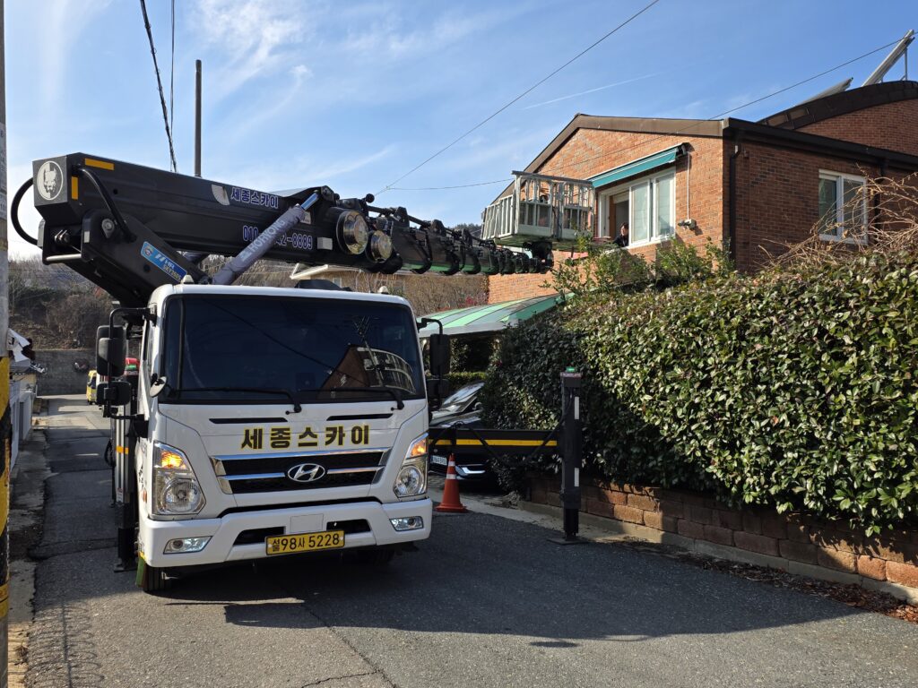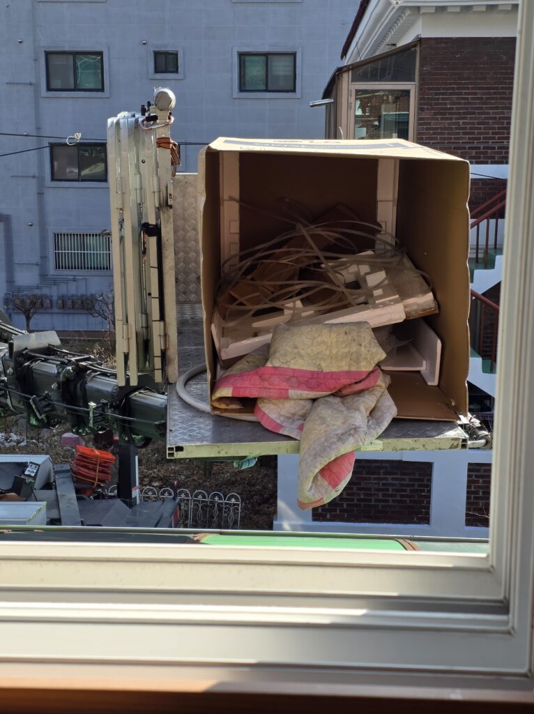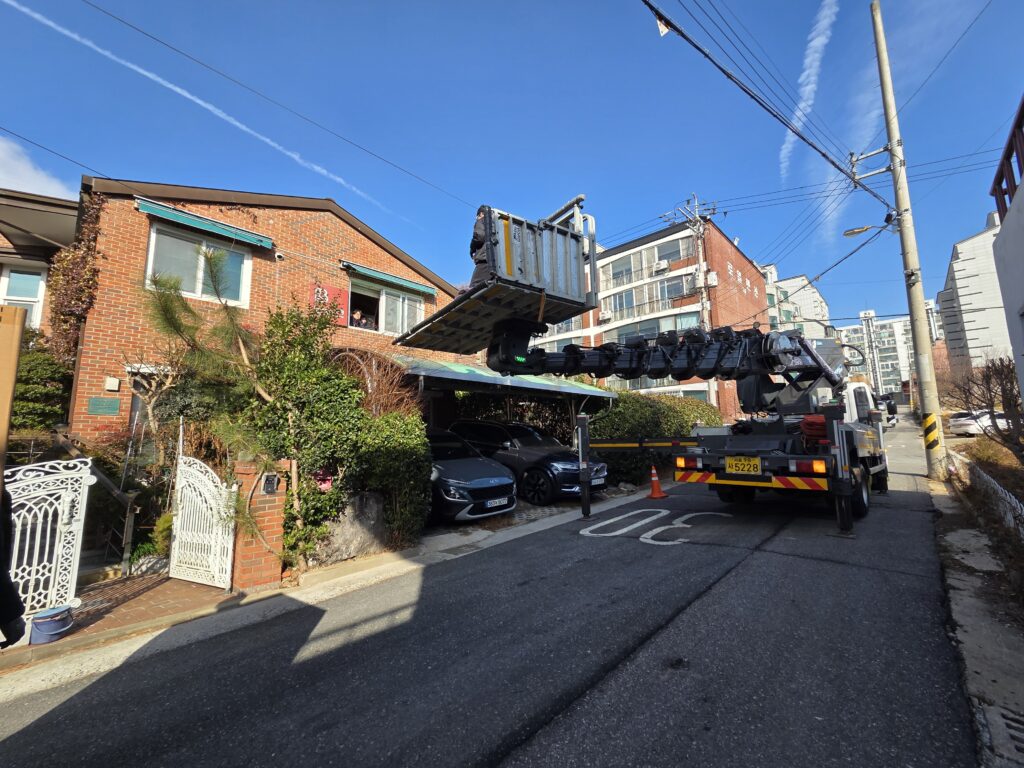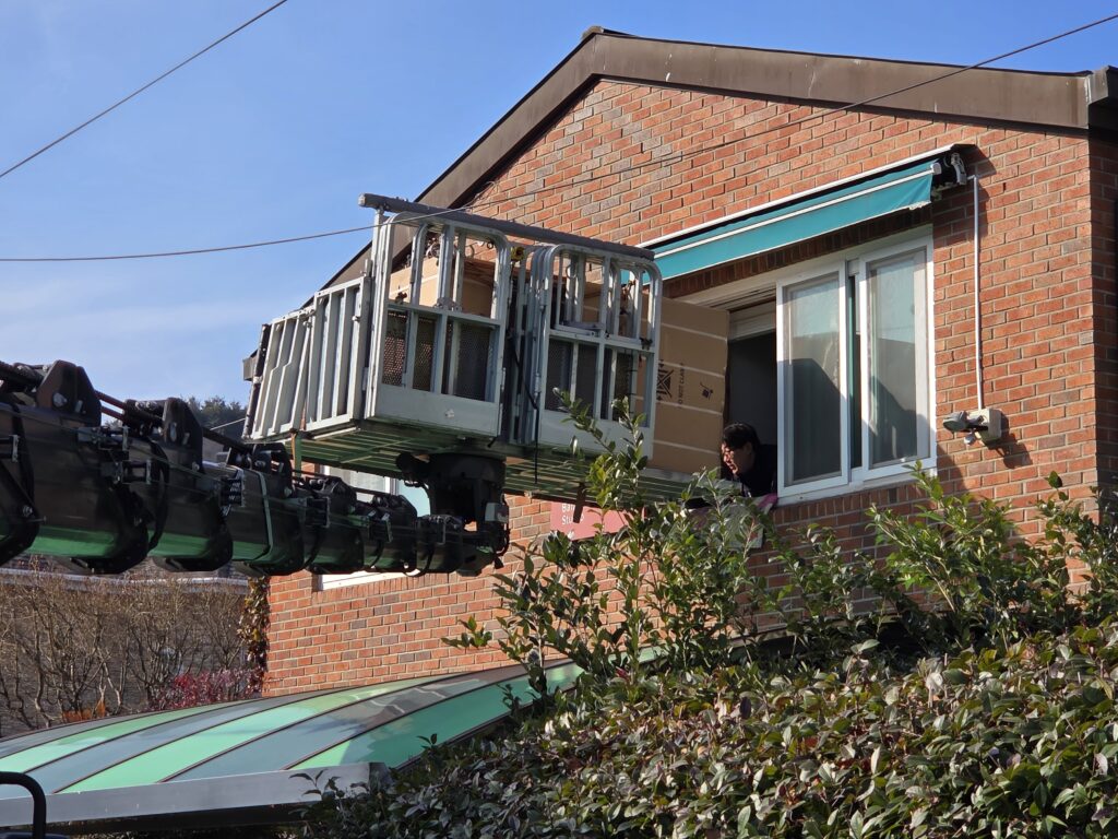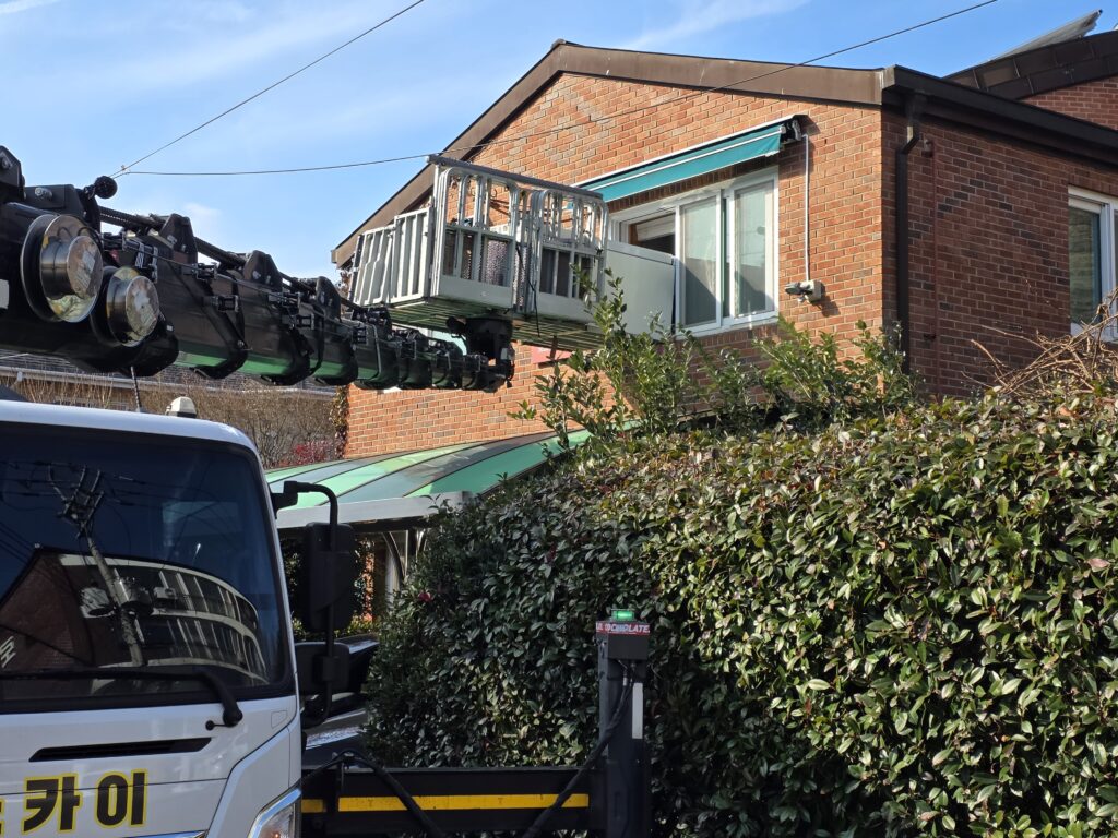 월요일이 되면서 냉장고를 들이는 방식에 대한 고민이 되었다. 사다리차를 쓰면 될 것 같은데, 주차장 지붕이 걸릴 듯하다. 일요일 밤에 전화하여 배송 예정시간은 12시-1시 정도로 이야기했었다. 시간이 되어가서 냉장고 물건을 빼내고 정리하는데 11시반쯤 도착한다고 전화연락이 왔다. 냉동실 식품은 아이스박스에, 냉장실 식품은 종이박스에 담았다. 배송직원들이 도착하는데 보니 거대한 사다리차가 함께 왔다. 자기들이 도로뷰로 우리집을 보니 일반 사다리차로는 곤란할 것 같아서, 소위 스카이차를 데려왔다는 것이다. 먼저 기존의 냉장고를 내리고, 새 냉장고를 올렸다. 창문을 떼지 않고도 열린 공간으로 가능했다. 창문틀에 있는 철물을 잠시 제거하고 공간을 조금이나마 확보했다. 생각보다는 빨리 작업이 마무리되었다. 특이한 점은 새 냉장고 문짝이 반자동 방식이다. 병원 병실문에서 많이 적용하고 있는 반자동 방식과 동일하다.