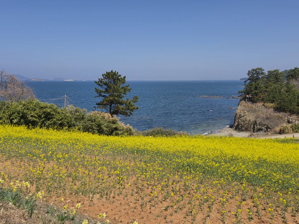 어제 TV에서 여기를 소개해서 한번 다녀오자고 하여 10시반경 집을 나섰다. 1시간 정도 편안한 길을 달려서 현장에 도착했다. 길목에서 차량 출입을 막아서 미리 주차하고 걸어서 올라갔다. 면적은 그리 넓지 않으나 유채밭이 볼만하다. 바다도 함께 볼 수 있으니 상쾌했다. 근처에서 바지락 칼국수를 먹고 집에 돌아왔다. 오랫만에 집사람과 바람을 쐬고 왔다.